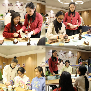 活动邀请高级茶艺师现场倾情授课,通过“理论+展示+实践”形式展现中华茶文化魅力。活动中,茶艺师详细介绍了中国茶文化,以优雅仪态示范站、坐、谢茶礼仪,手把手讲解紫砂壶、盖碗等茶具的妙用及冲泡技巧,以行云流水的冲泡手法引发全场同学赞叹。在实操环节,同学们跃跃欲试,人人参与“温杯、投茶、注水、分茶”等实操体验,分组操作茶具时专注模仿,品鉴环节举杯细嗅、轻语交流,从陌生到默契,茶席间流淌着温暖,现场茶香交织萦绕。互动环节妙趣横生,老师以趣味问答解密茶文化,同学们互相分享品茶心得,最后师生合影定格了满室茶香与青春笑颜。