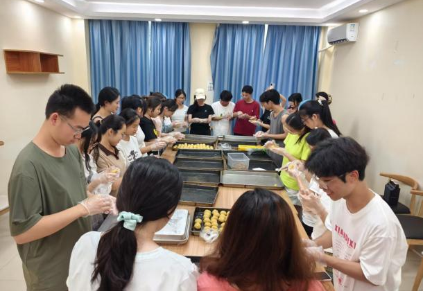 手工制作核桃酥将现场氛围推向高潮。师生们围聚在一起,一边揉捏面团、雕琢造型,一边交流技巧、分享心得,大家将美好期盼与节日祝福融入舟形、粽形、爱心形等各式核桃酥坯中。